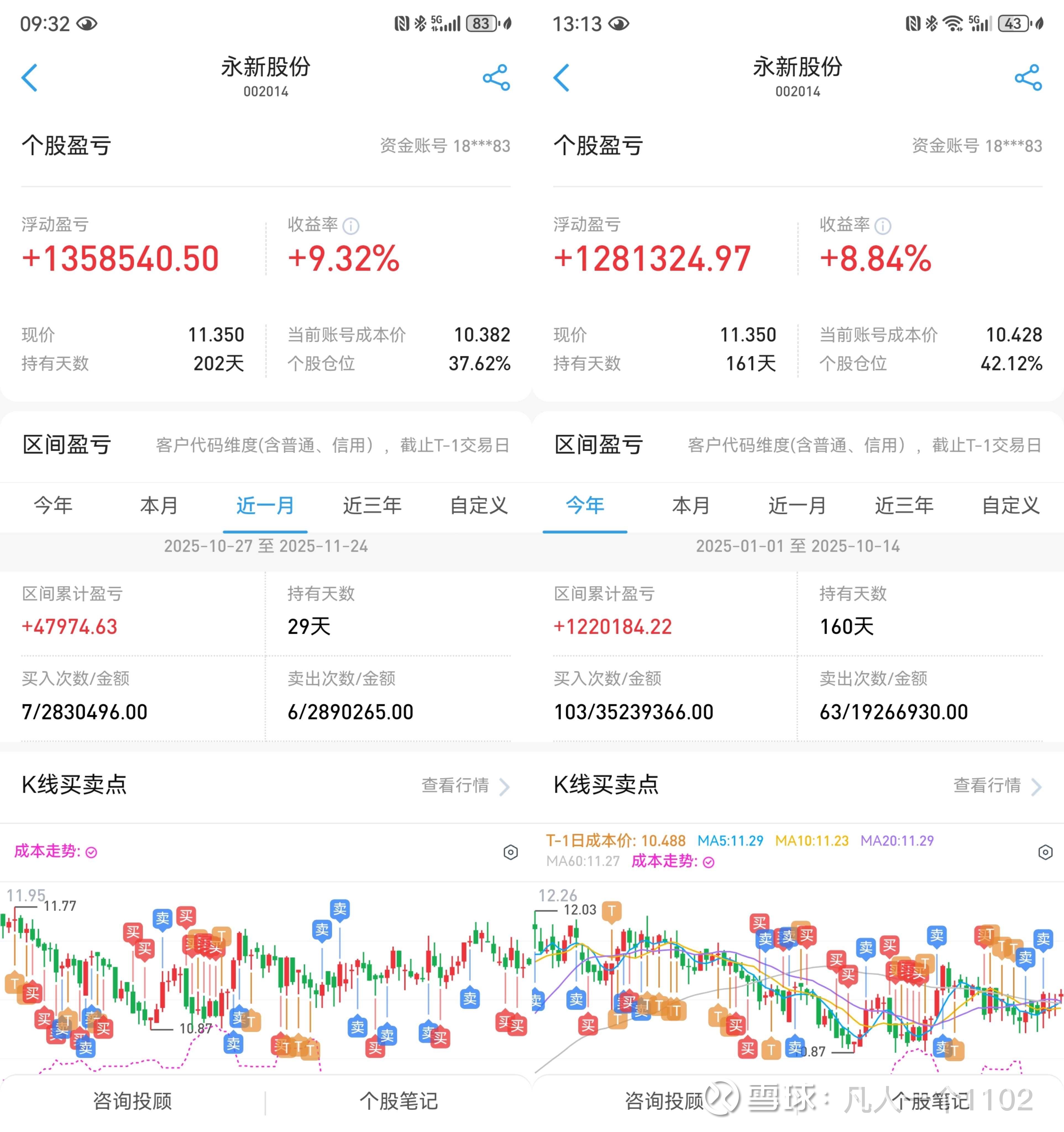 上次夸永新持股体验好的时候记录了盈利情况,今天在股价相同,持股数量相同的情况下,盈利多了7万多块钱,虽然比例很低,但是绝对值已经足够覆盖同时间的生活成本,某种意义上说,这也是一种财富自由吧