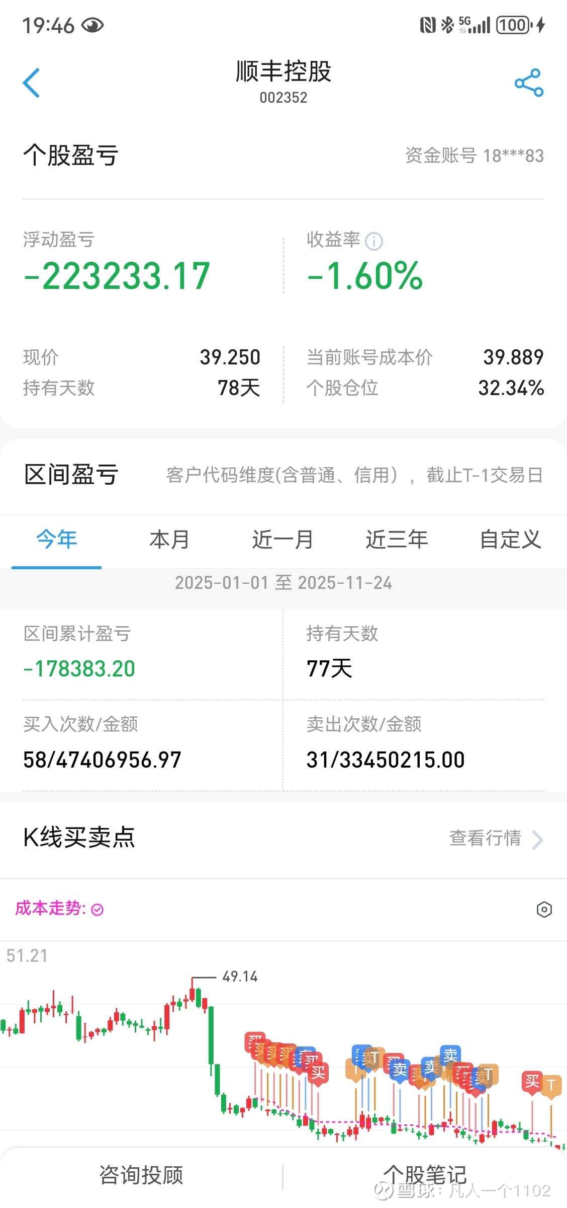 顺丰的成交量要大很多,比较好做网格。从42块多开始买入,到现在39.3,每股差不多亏掉3块钱,按照我的持仓量,累计亏损应该在六七十万,实际到今天我才亏掉二十万多一点,也就是说网格提供了差不多40多万的收益,无论是绝对值还是相对值都挺可观的。