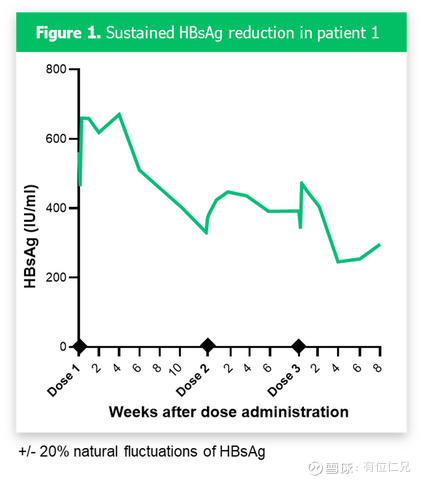 Precision BioSciences一期临床ELIMINATE-B 研究队列1由三名患者组成,每名患者计划接受3次0.2mg/kg 的 PBGENE-HBV 给药,每次间隔约8周。与基线水平相比,第1、2和3名患者的最佳反应分别降低56%(0.36 log)、69%(0.51 log)和47%(0.28 log)。队列 1 中三名患者中的一名 (33%) 截止日前(即 PBGENE-HBV 初始剂量后 7 个月)的 HBsAg 较基线持续降低约 50% (0.3 log)。