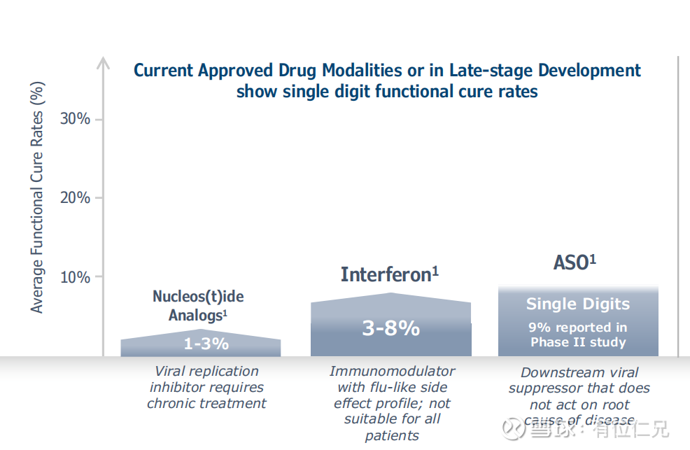 目前已完成的不筛选病人的联合疗法(siRNA/ASO+干扰素)试验中,停药后半年的治愈率在15-30%之间,尽管已经比干扰素3-8%的治愈率显著提升,其治愈率仍然太低,而目前的技术对于治愈率的提升有限。