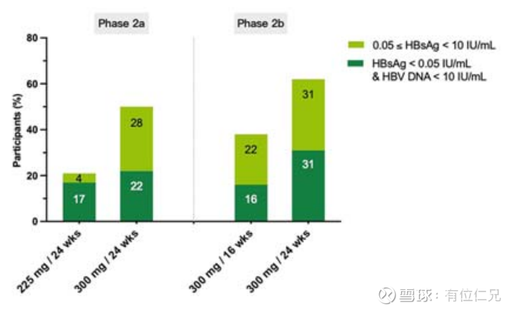 AHB-137(浩博医药,ASO):2b临床纳入小三阳的患者,治疗数据显示,治疗结束时,300mg组给药24周实现75%转阴率,给药16周实现66%转阴率。停药24周(下图),给药24周组实现31%,给药16周实现16%。