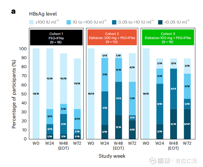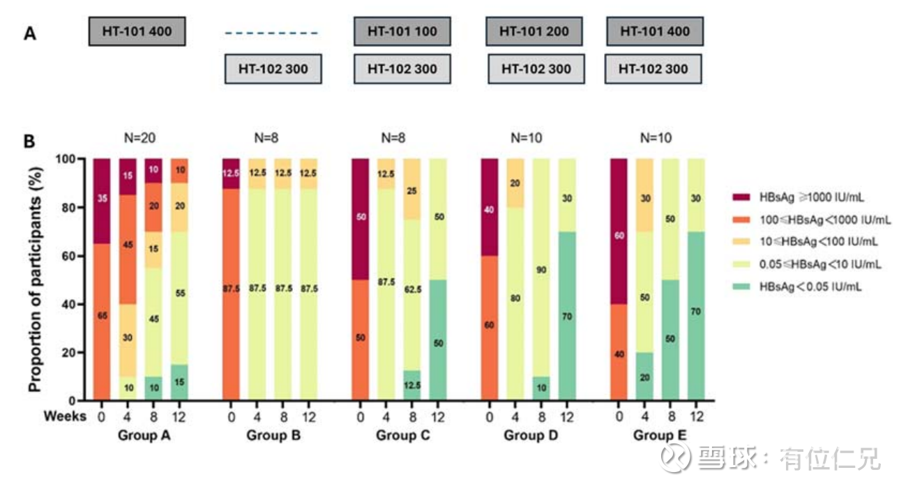 HT-101、HT-102(星耀坤泽,siRNA、中和抗体):二期临床纳入小三阳的患者,目前临床还在进行中,给药到12周的数据显示, C组实现50%转阴率,D、E组都实现70%转阴率。在C至E组的28名患者中,抗原基线< 1,000 IU/mL的患者实现13/14 (92.8%) 转阴,抗原基线≥1,000 IU/mL的患者实现5/14 (35.7%)转阴。
