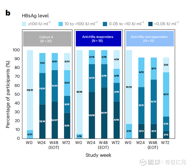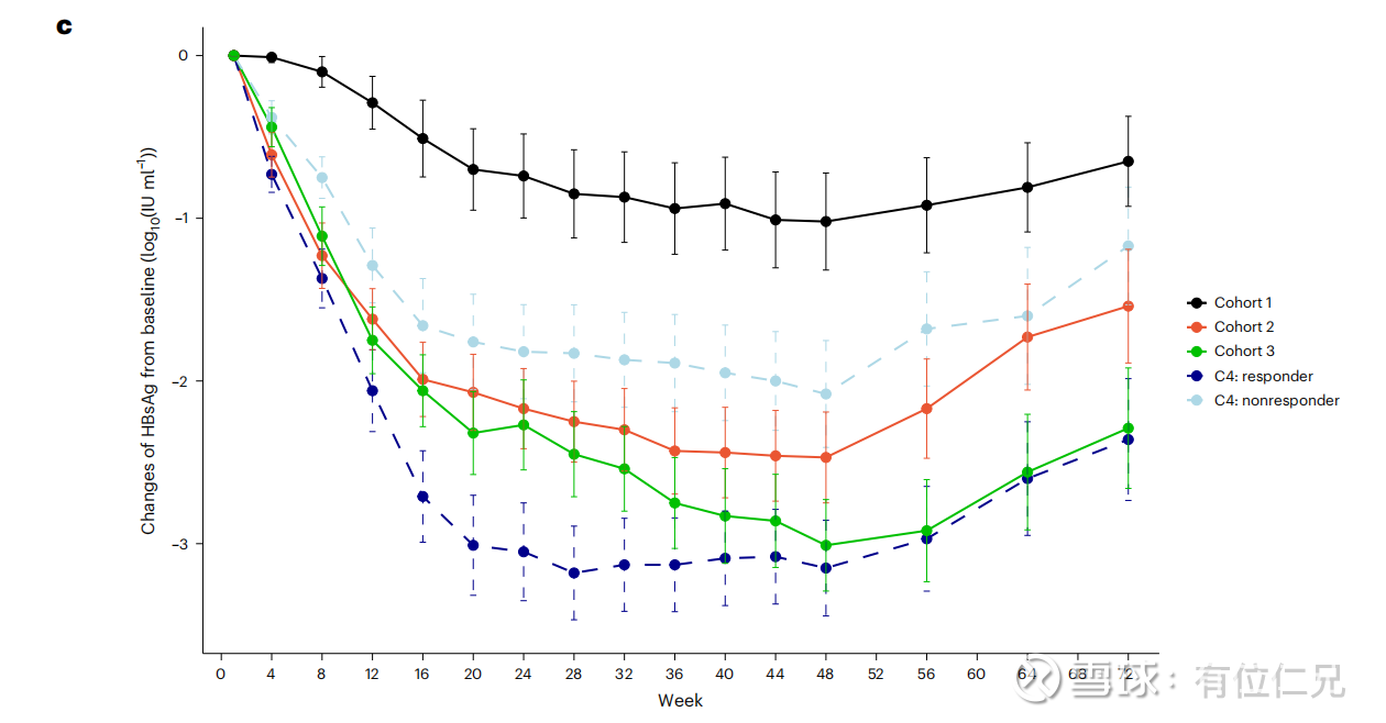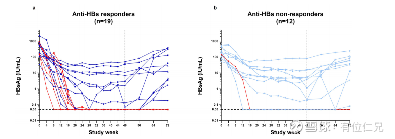 在队列4患者抗原下降曲线中,在高免疫反应组无法被治愈的患者中,其下降趋势和低免疫反应组的大部分患者一样,无论怎么用药,反应都不明显。而能被治愈的患者呈现快速下降的趋势,高免疫反应组的8名患者(下图红线)在24周已有7/8(87.5%)被治愈,低免疫反应组的趋势也是如此。这得出一个惊人的结论:能被治愈的患者会在很短时间就被治愈,而不能被治愈的患者即使给予很长的治疗时间也很难被治愈。