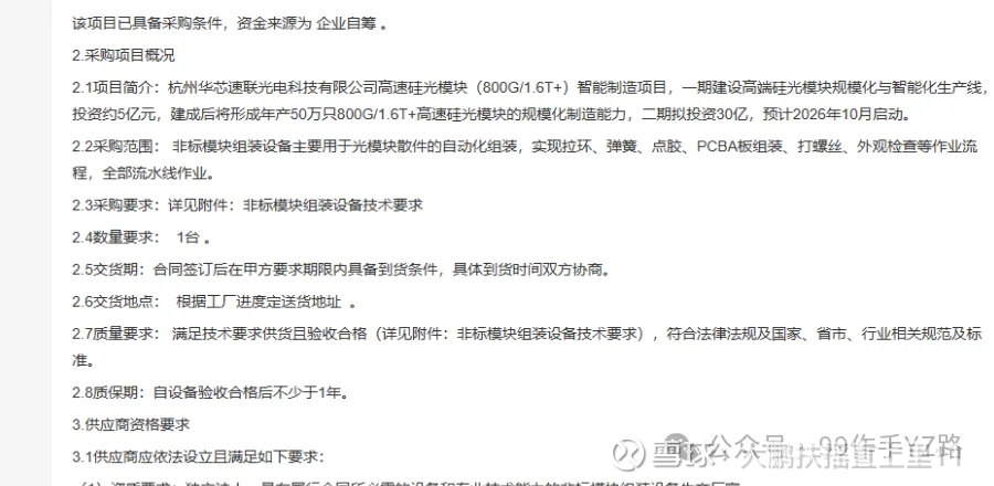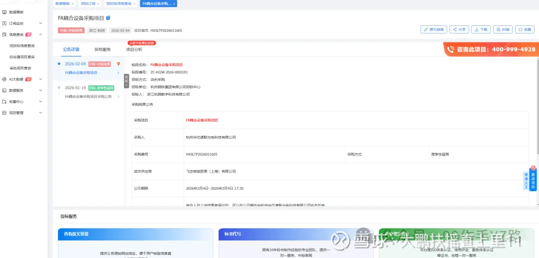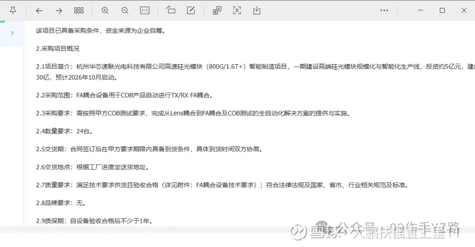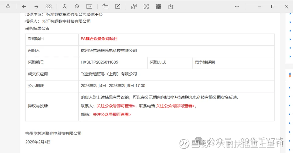 一月份的时候杭钢的子工资华芯速联光电已经给了公告,当时是要一台FA耦合设备采购项目,但是我估计是谈了以后发现买少了,于是那个订单延迟了,重新出了一个公告就是下面的这个
