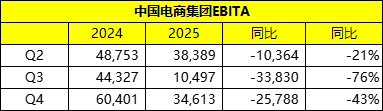 以下是2025年4月淘宝闪购加入外卖大战以来各个季度的EBITA数据,可以看到从2025年Q2到Q4,EBITA累计减少了约700亿,也就是说,为了即时零售的投入,阿里约损失了700亿的利润。
