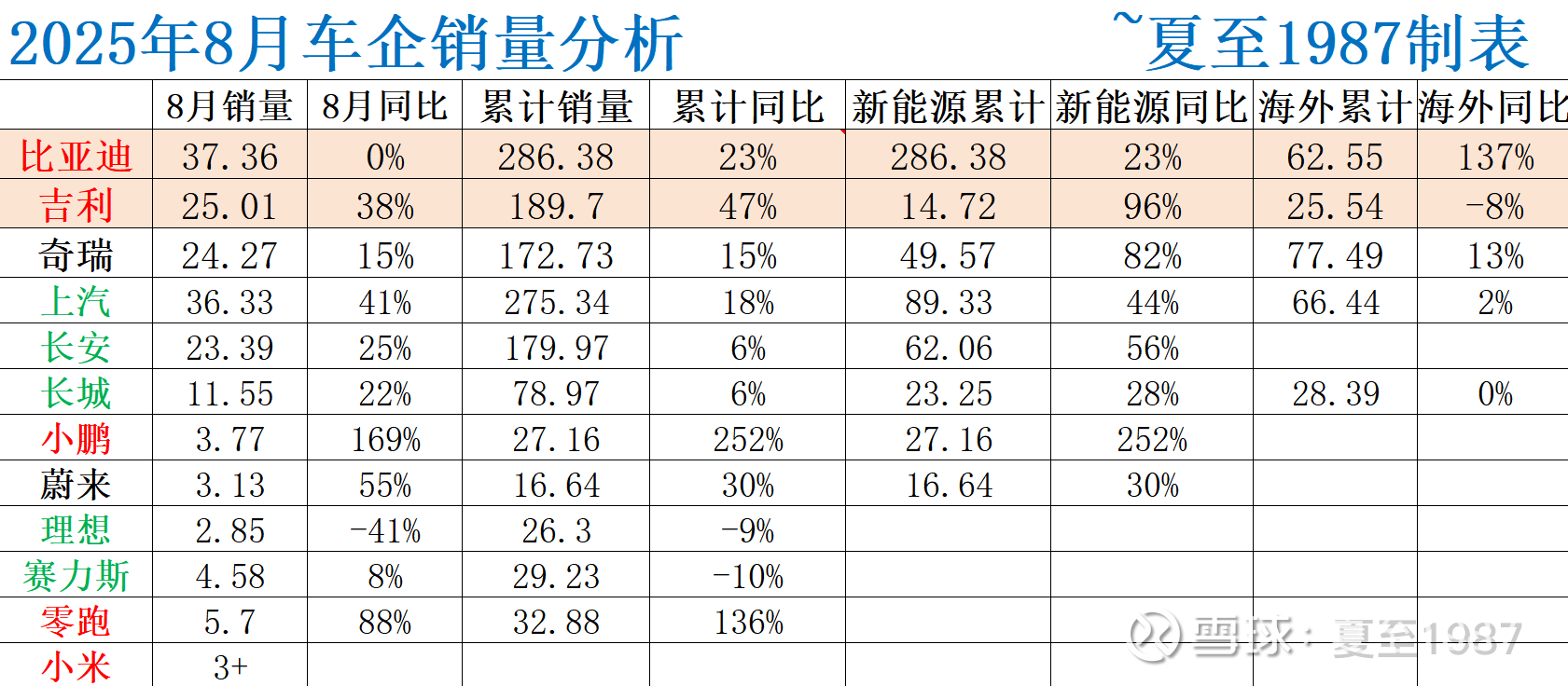 放一个我统计的8月主流车企的销量数据表吧: