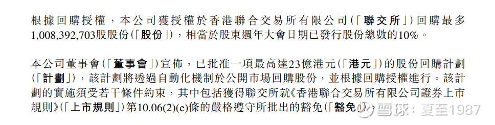 回购上限23亿港元,是5月30日披露的回购计划的一部分(上限是总股本的10%,分期回购),回购的股份予以注销。