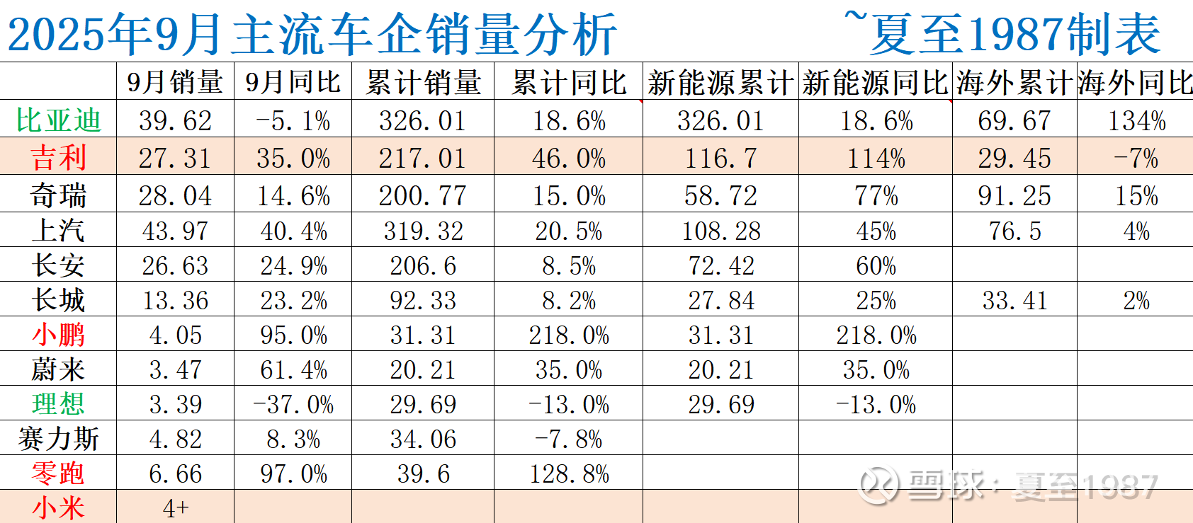 新势力9月表现最好的有,小米的4万+,小鹏的4.05万(同比95%),零跑的6.66万辆(同比97%)。