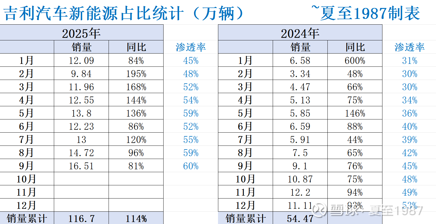 可以看出今年每个月新能源销量同比增速,都非常的高,动辄100%以上,吉利的新能源车渗透率从去年底的不到50%,已经稳步提升到今年8月到9月的60%。