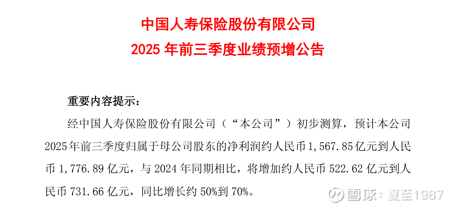昨天中国人寿发了业绩预增公告,前三季度归母股东净利润预计能达到1567亿到1776亿人民币,比2024年增加522到731亿人民币。