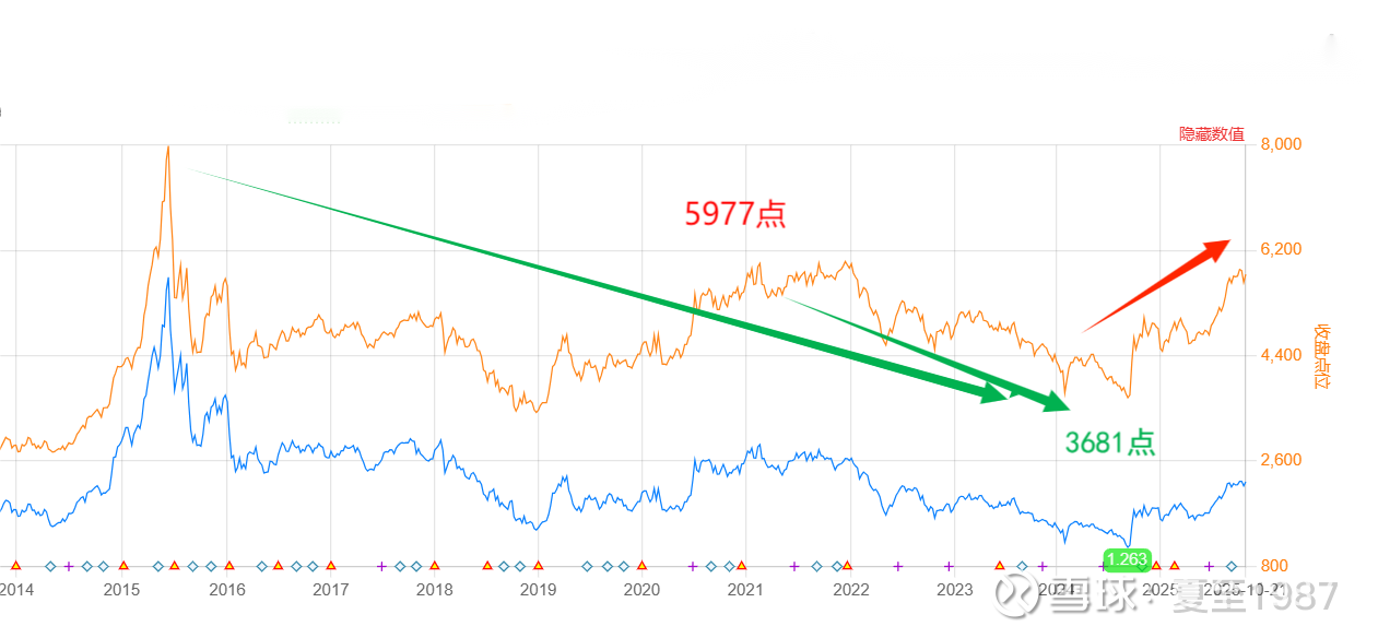 指数震荡的十年,期间只有一个小高点,是2021年2月的5977点。