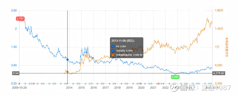 作为银行指数整体,第一次破净的时间点应该是在2013年的11月: