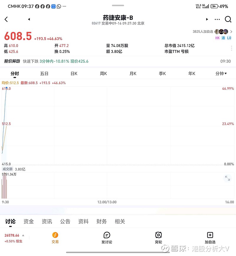 $药捷安康-B(02617)$ 由50元開始發現,是上星期的事,今天是600元,究竟發生了什麼事?你們經常問我買入的邏輯,又經常爭辯公司高負債,沒盈利。不如你們又告訴我,看到了什麼新觀點,亮極新邏輯