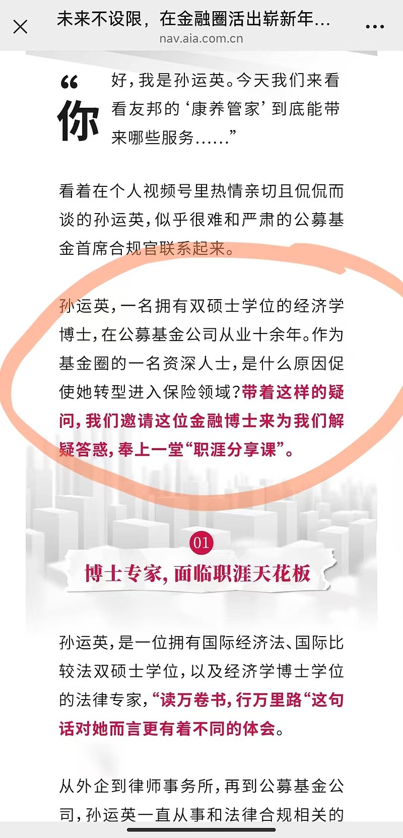 结果这还没完,友邦保险宣传:基金公司的首席合规官,拥有博士学位(还有两个法律方面硕士学位),在公募基金从业十多年以后,也去友邦保险卖保险了。