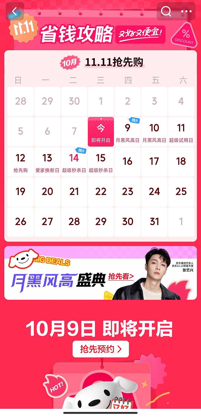 太狠了,双十一提前一个多月。今天某东给我推送,明天,也就是十月九号晚上八点,开始双十一了。现在双十一越来越提前了,这都提前一个月了。我在想未来会不会有一天,双十一从结束618促销就开始了,618从结束双十一双十二开始了。