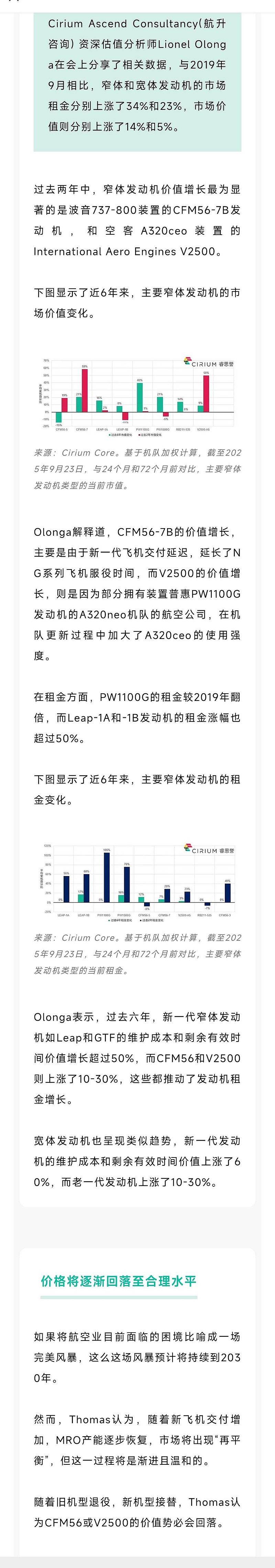 还是航空租赁。这次专门提及发动机,租金和交易价格上涨,这个大家都知道——在租金方面,PW1100G的租金较2019年翻倍,而Leap-1A和-1B发动机的租金涨幅也超过50%。这次更新的内容是我之前一直预计27年底28年初,航空产业供给恢复正常,也就是好日子还有两三年。结果现在航空咨询机构觉得2030年才能逐步恢复正常,五年以后了。原文网页链接$中国飞机租赁(01848)$ $中银航空租赁(02588)$ $渤海租赁(SZ000415)$