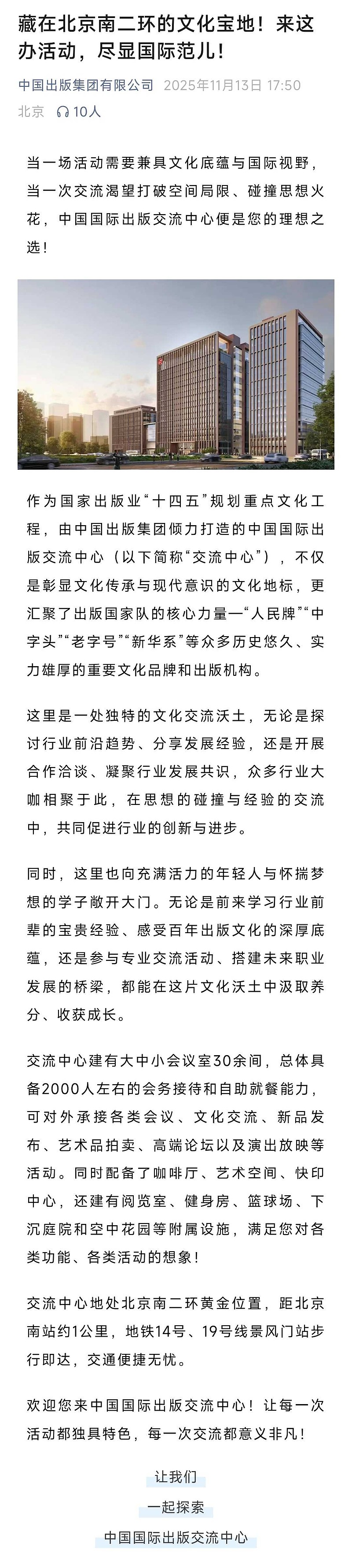 看来大家都想着开源节流,连中国出版集团这种高级别的出版社也开始把集团新楼的会议中心,剧院拿出来对外出租,承接活动来增加收入。中国出版集团有人民文学出版社,商务印书馆,三联书店,荣宝斋,中华书局等等。$中国出版(SH601949)$