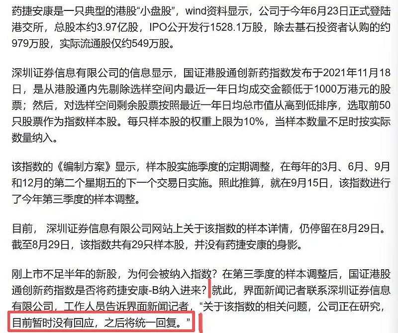 当时药捷安康纳入指数,闹出新闻(图二),有记者采访指数编制方深圳证券信息有限公司,工作人员回复说是正在研究,稍后公司会给回复,参见图1。