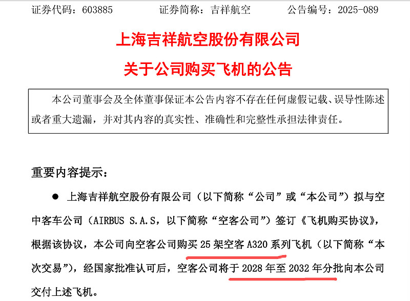 我看了看,交付时间,现在下单,都要几年以后交付,其中吉祥和春秋公告里面说是28到32年交付,中飞租说是33年前交付,也就是两三年以后才开始交付第一架,六七年以后才能交付完成。