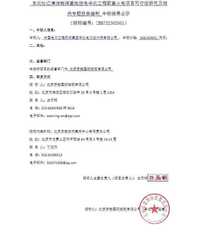 1月28日,北京京能电子商务平台发布东北松辽清洁能源基地送电华北工程配套火电项目可行性研究及相关专题报告编制中标结果公示,中国电力工程顾问集团东北电力设计院有限公司,中标价格:568.000001万元。