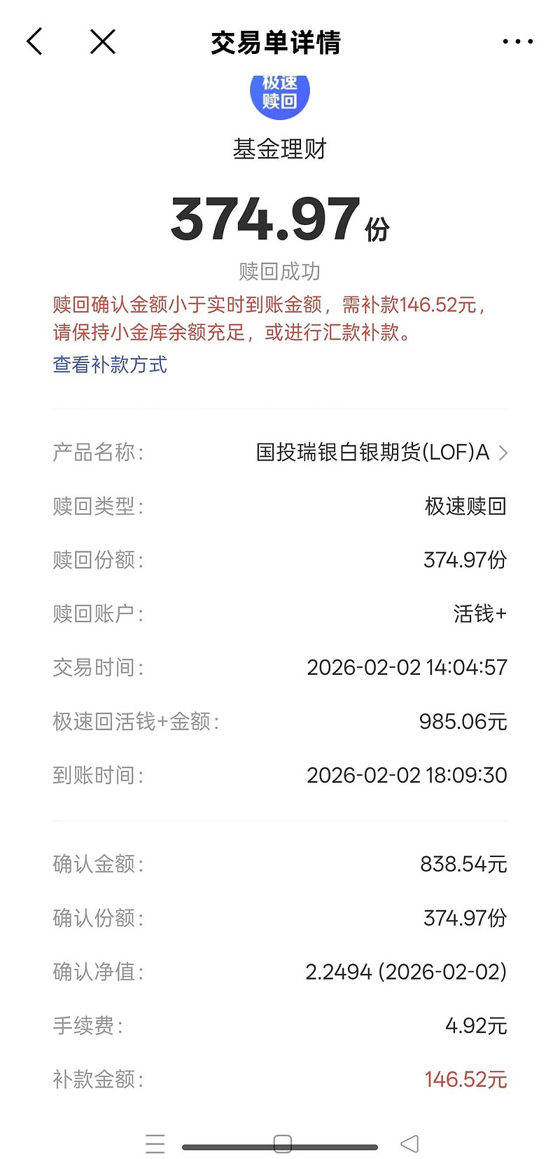 有投资者发帖,国投白银LOF基金,京东快速赎回,80%金额垫资,留下20%安全垫,平时没问题,结果昨天白银一天跌了31%,投资者都要给京东金融补钱。就是100块钱的基金,你赎回,京东按照前一天净值提前给80块钱(留了20块钱安全垫),结果跌了31%,京东只能得到69元,等于京东多给你11块钱,你得补钱。当然这不怪京东金融,谁也没想到国投白银LOF能搞出这一出。后续是京东金融已经按照60%进行快速赎回垫资了。