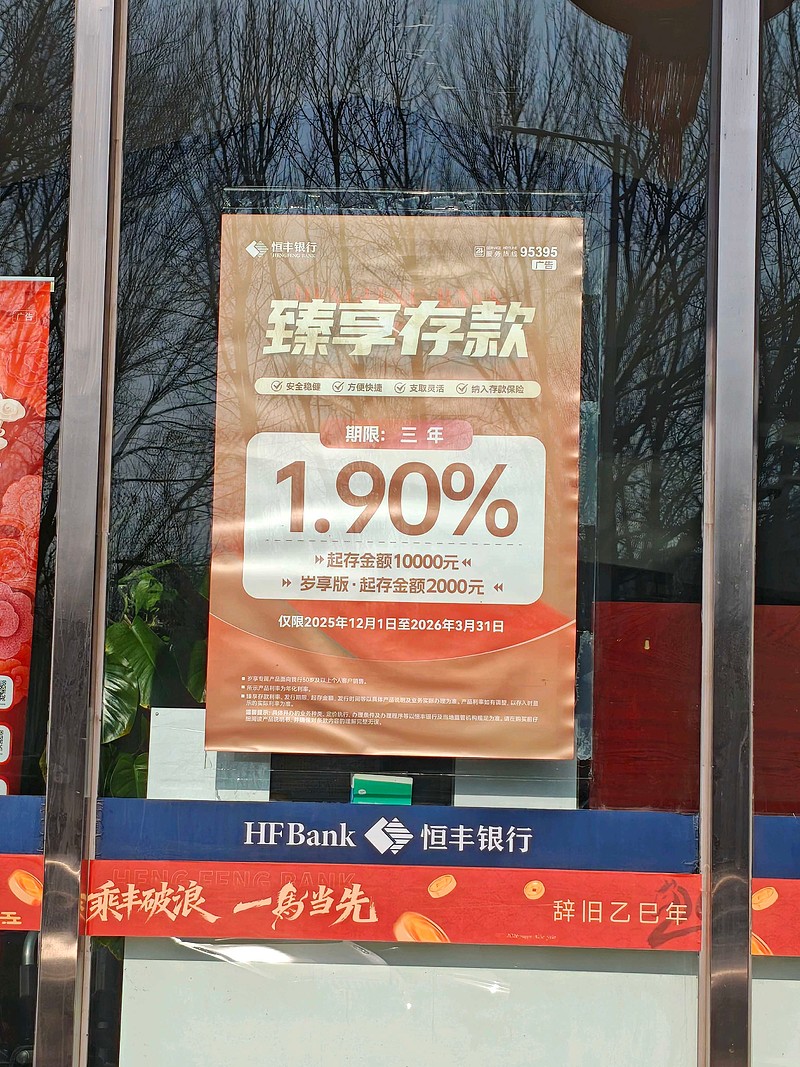 过年走亲戚,路过我们胶州的恒丰银行网点,没开门,但是贴着宣传,三年定期1.9%,一万起存,但是过年期间(从25年12月到今年三月底),2000就行。这个利率不低啊。恒丰银行还是山东国资和中央汇金共同持股的全国性股份制商业银行,当然也是唯二没上市的全国性股份制商业银行,另一个是中国人寿控股的广发银行。声明非广告,请勿据此投资理财。#2026年春节见闻#