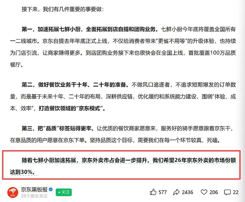 又喊话了,26年外卖占比希望达到30%。。。