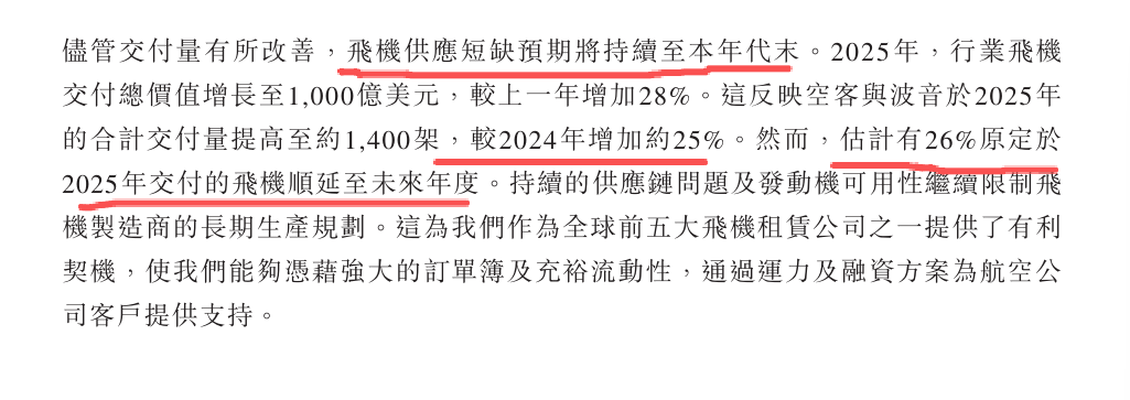 我下午看了看$中国飞机租赁(01848)$ 的业绩,今晚又看了看$中银航空租赁(02588)$ 的业绩,我本来想长篇大论的分析的,但是我觉得我直接用中银的业绩内容来说吧:25年波音和空客产量提高了25%,很高兴对吧,供应好了,但是延迟交货了26%的飞机到今年,这等于越拖越多,中银预计飞机供应链短缺要到持续到差不多本年代末,也就是差不多2030年查看图片