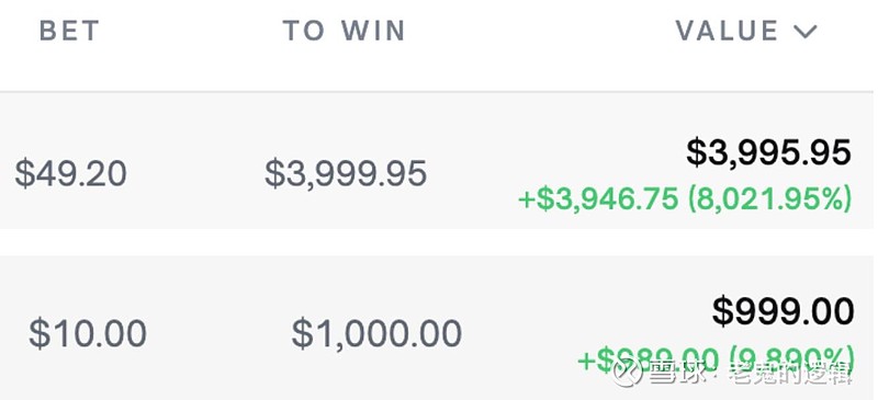 调整了几次策略,跑了一个多月,效果还不错,可以给各位看看这个月收获的两笔交易,一笔本金50刀,回报4000刀,80倍赔率,一笔本金10刀,回报1000刀,100倍赔率。