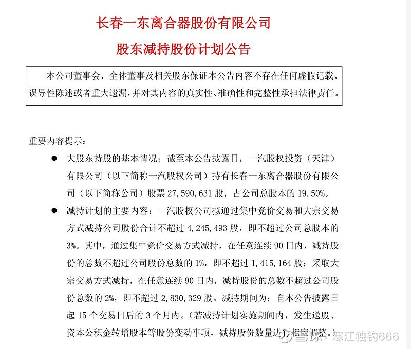 一汽股权投资已连续发布公告进行减持,2025年8月16日公告计划在三个月内减持2.97%,期满后只减持了1%。今天盘后又发布公告计划在90天内减持3%。