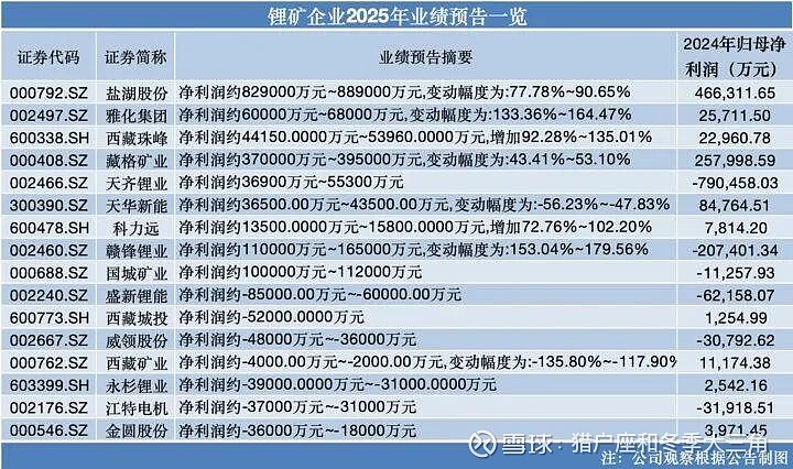 三复盘业绩预增的锂企来看,除了自身锂盐业务“一体化”程度较高、受益锂价反弹外,他们中的多数还为多矿种“混业经营”,其他业务的景气度提升,也为其业绩锦上添花。以藏格矿业为例,除了碳酸锂业务快速复产,全年实现碳酸锂产量8808吨、销量8957吨贡献业绩外,公司氯化钾及参股公司西藏巨龙铜业有限公司(以下简称“巨龙铜业”)投资收益也贡献甚大。根据其公告,公司全年实现氯化钾产量103.36万吨、销量108.43万吨, 受市场供需等因素推动,2025年氯化钾销售价格同比增长,驱动该业务收入与利润的强劲增长。数据显示,2025年,氯化钾(60%粉,青海盐湖)出厂价由2550元/吨升至年末的3100元/吨,年度均价为 2938.1元/吨,同比增幅16.68%。另外,藏格矿业参股的巨龙铜业可谓其利润“奶牛”。2025年,受益于铜价上涨(伦铜全年涨幅达到42.52%)及产能释放,其营业收入及净利润均实现同比大幅增长,公司确认的投资收益约为26.8亿元,占到公司盈利37亿元-39.50亿元的67.85%-72.43%。且正因为有巨龙铜业的存在,2023年-2025年的锂价杀跌期间,藏格矿业盈利下滑幅度远小于其他同行。2023年、2024年,公司对巨龙铜业的投资收益为12.63亿元、19.28亿元,占公司盈利的比重高达37%、75%,极大对冲了锂价的下行。无独有偶,盐湖股份的盈利中也有氯化钾的贡献。业绩预告披露,2025年,公司氯化钾产量约490万吨,销量约381.43万吨;碳酸锂产量约4.65万吨,销量约4.56万吨;两钾(氢氧化钾、碳酸钾)合计产量约38.22万吨,销量约38.89万吨。钾行业的景气度提升显著增厚公司业绩的增长。西藏矿业(000762.SZ)却是个例外。2025年,就在同行多矿种齐景气、量价齐升时,主营铬铁矿、锂矿的西藏矿业却量价齐降,预计营收3.30亿元-4亿元,同比下降35.71%至46.96%;归母净利润-4000万元至-2000万元,同比下降117.90%至135.80%。2024年,公司盈利11174.38万元。值得一提的是,天齐锂业、赣锋锂业等的业绩预增还主要受益于投资收益的增加。比如,天齐锂业在2025年确认的对联营公司SQM的投资收益较2024年同期大幅增长;赣锋锂业则预计要来自持有的澳大利亚锂矿商Pilbara Minerals Limited(PLS)股票价格上涨带来约10.3亿元公允价值变动收益。锂盐项目正在建设中的国城矿业(000688.SZ),其业绩增长则主要来自于非经常性损益,公司完成对国城实业60%股权的收购,后者2025 年度预计实现净利润 11-12 亿元;完成对赤峰宇邦矿业有限公司 65%股权的出售并确认相应的投资收 益,影响归属于上市公司股东的净利润约 6.58 亿元。