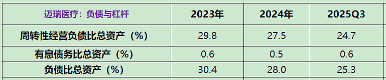迈瑞医疗的财务状况:截至 2025 年三季度末,公司资产负债率 25.34%,虽然高于恒瑞医药,但仍处于较低水平,且有息债务占比仅0.5%。公司货币资金 171.33 亿元,保持了充足的流动性。