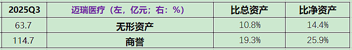 商誉减值风险是迈瑞医疗最大的财务风险。截至 2025 年中,公司商誉规模高达 115 亿元,占净资产近 30%,主要来自惠泰医疗等收购。商誉减值测试依赖主观假设,需要预估毛利率、增长率等参数,而 2025 年 H1 三大业务毛利率普降 2.7-4.6 个百分点,核心变量已偏离乐观预期。若被收购企业(如惠泰医疗)未来业绩未达预期,可能触发大规模商誉减值,直接侵蚀公司利润。
