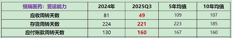 恒瑞医药的财务状况:截至 2025 年三季度末,公司资产负债率仅 12.14%,财务杠杆极低,偿债能力极强。公司货币资金高达 403.64 亿元,较上年同期的 221.32 亿元大幅增长82.38%,现金储备充裕。更重要的是,公司经营活动现金流表现优异,2025 年前三季度经营活动现金流净额 91.10 亿元,同比激增 98.68%,盈利质量显著提升。