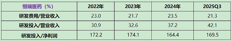 从研发投入强度看,恒瑞医药明显高于迈瑞医疗,21.3% 的研发费用率体现了创新药行业的高投入特征。但从研发投入的绝对值看,考虑到两家公司营收规模相近,恒瑞医药的研发投入绝对额约为迈瑞医疗的 1.8 倍。