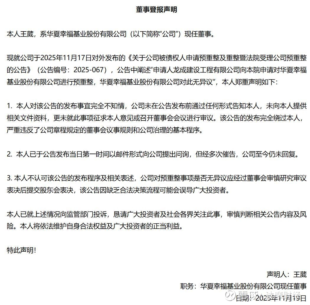 华夏幸福董事王葳发布登报声明称,对公司预重整相关公告的发布“完全不知情”,且该公告“严重违反了公司章程规定的董事会议事规则和公司治理的基本程序”。王葳表示,本人不认可该公告的发布程序以及相关表述,并已就上述情况向监管部门投诉。