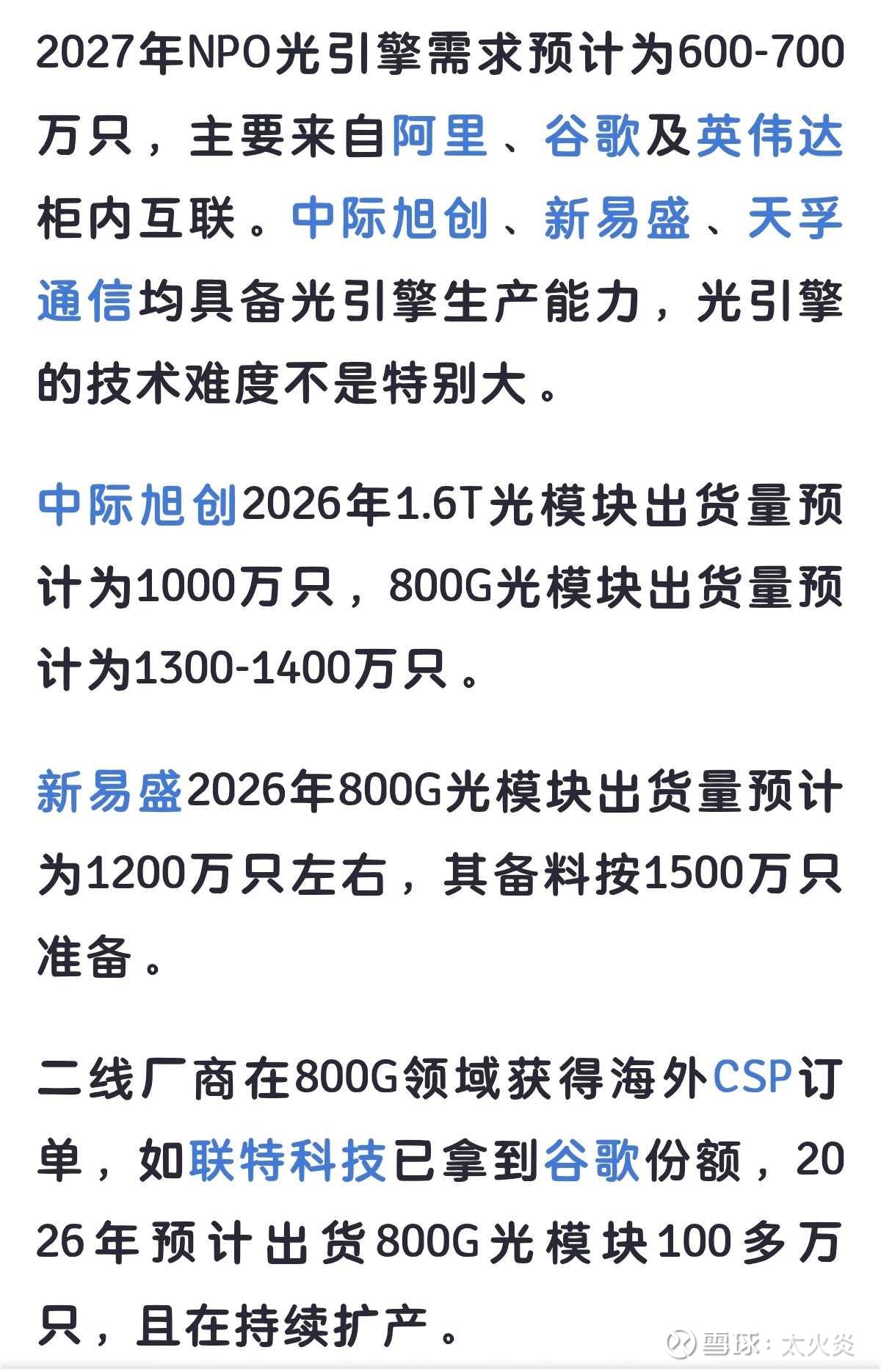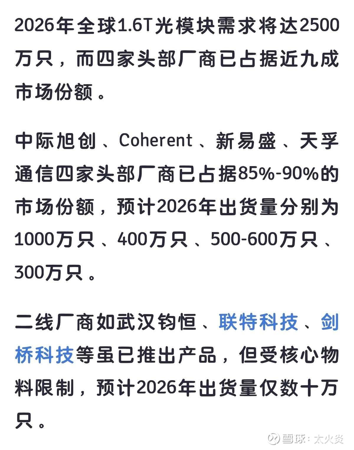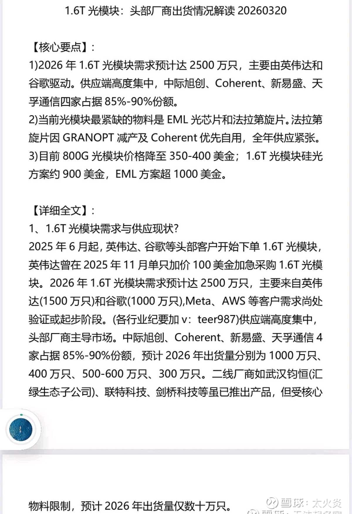 这个调研报告说汇绿,跟剑桥,联特今年1.6t也做不了多少。联特因为有谷歌这个客户今天跌的不多,剑桥,汇绿直接跌停。剑桥科技去年11月说去年底小批量出货1.6t,今年一季度大批量交付1.6t。这个报告是今年全年也就小批量。。也没业绩,也没订单,也没真消息,也没个靠谱的说法。#剑桥科技#