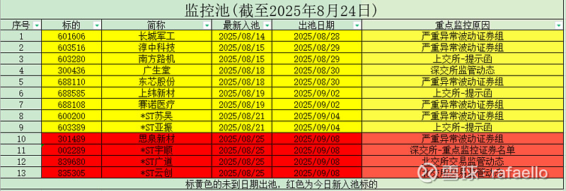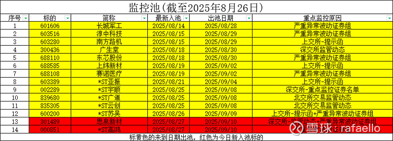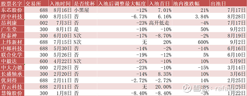 2周结束了,这个表也可以给你们看了。在池子里超过20%就是要续期的,不过东芯更厉害,直接黑屋了。这表留存吧,以后做异动票用的上。另外,有思泉的也悠着点,你们有点过了。已经进池子2天直接延期了。