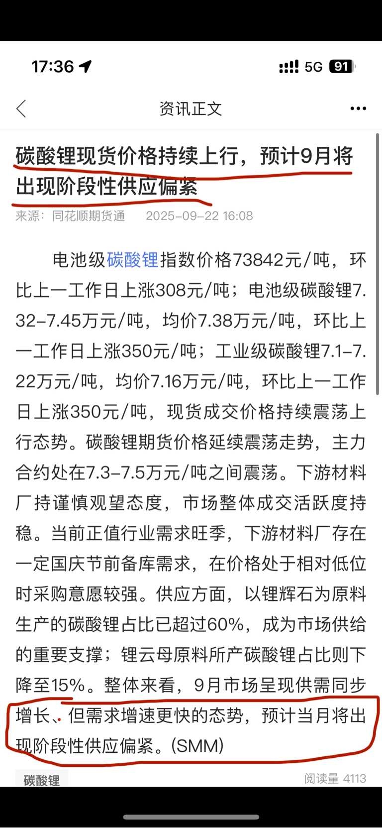 现在,回到碳酸锂的逻辑中。目前,我们从海外进口的锂矿占比在58%左右,而进口的国家集中在澳大利亚,尼日利亚和智利上。而这些国家,都因为锂矿价格过低而减少出口产能。国内锂矿之前主要由江西那边供应,供应的锂云母占比是在40%左右(这些数据我问的豆包,有错找他)。而这40%目前是要停产的,在9月底会出结果。而需求上,储能,新能源车电池等需求旺盛,2025年9月中国市场动力+储能+消费类电池排产量同比增长38.2%。这点远高于目前碳酸锂产能的供应。而且,这需求还在增加。所以你能看到瑞浦兰钧和天赐材料合作,锁定六氟磷酸锂产能。缺德和龙蟠,富临签订合同,锁定磷酸铁锂产能。如果不是需求旺盛,需要这么着急签订这么大的订单来锁定自己电池前驱体产能呢?这不是怕到时候到时候供不应求了嘛?所以,碳酸锂的上涨逻辑其实是很顺的。国外产能主动减少,国内最大的几个矿,停产。产能减少而需求旺盛。即使现在还供不应求,等多一两个月,也会转换。缺德是知道这一点的,所以,在事件结果出来前,疯狂打压,然后锁定产能,实现利益最大化。你能说他蠢嘛?不是,单纯的坏而已。现在碳酸锂价格已经涨了一周了,不过,也才一周而已。目前还在73000左右而已,还没上10w呢,时间还充裕。还有一到两个月的时间,涨价逻辑才能被现实照射,到那时,资金才会涌进。而在那之前,享受目前的震荡时光吧。认准两个事件节点,等着上另外一个平台就行。六氟磷酸锂从6月份开涨到8月底出成果,天赐,多氟多享受到了此逻辑,用了半个月时间拉升。中矿我也有足够的耐心等待他这段逻辑的兑现时期。目前,一切都在加速中,一切都在周期中,我等待着周期底部反转的时刻到来。