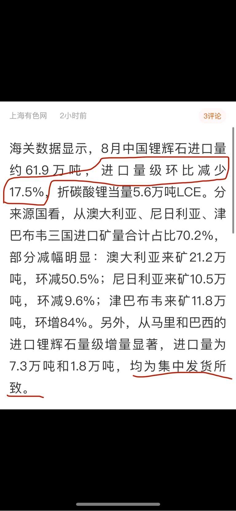 8月份初,宁德停产的消息,让中矿站上了40左右的平台,然后,9月初,储能需求大增的消息,让中矿彻底站稳在40-45的平台中。直到现在,在等待9.30江西八矿调查初步结果消息前,一直在大平台震荡。4月到6月,没有消息,处于碳酸锂周期底部的中矿,在25-30一线震荡了两个月。从八月到现在,在40-45的平台中也震荡了两个月。而目前,面对的有两个事件,一个是9.30江西锂矿判定事件,另一个是十月锗投产事件。这两个事件会是驱动中矿往45-50,还有50-55价格平台驱动的事件。当然,其中还会夹杂着类似碳酸锂价格上行,供需同步增加,但需求更加旺盛的消息出来。还会有海外进口锂矿环比下降,碳酸锂可能会出现阶段性供应偏紧的事件出来。这些事件,是维持中矿逻辑,让他稳定在平台上方的事件。当然,事件效应是会累积的,因为需求旺盛,而上游收紧锂矿供应,生产端肯定会发觉到上游偏紧而下游需求旺盛的情况出现,那么现在在成本价附近的碳酸锂上游,就会惜售手头的货物。继续观望,看手头的货物能不能继续上涨。