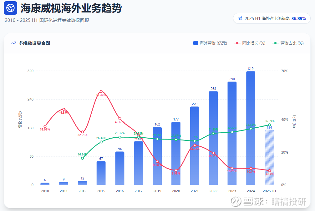 从数据中我们可以发现两点事实:1.稳健增长(2010-2024),营收突破 300 亿大关:2024年海外营收达到318.94亿元,同比增长10.10%。增速趋稳:从早期的爆发式增长(2015年57.36%)逐步过渡到成熟期的稳健增长(近三年维持在10%左右)。2.占比逐年攀升,从2015年的26.34%提升至2024年的34.48%,并在2025上半年进一步达到36.89%。