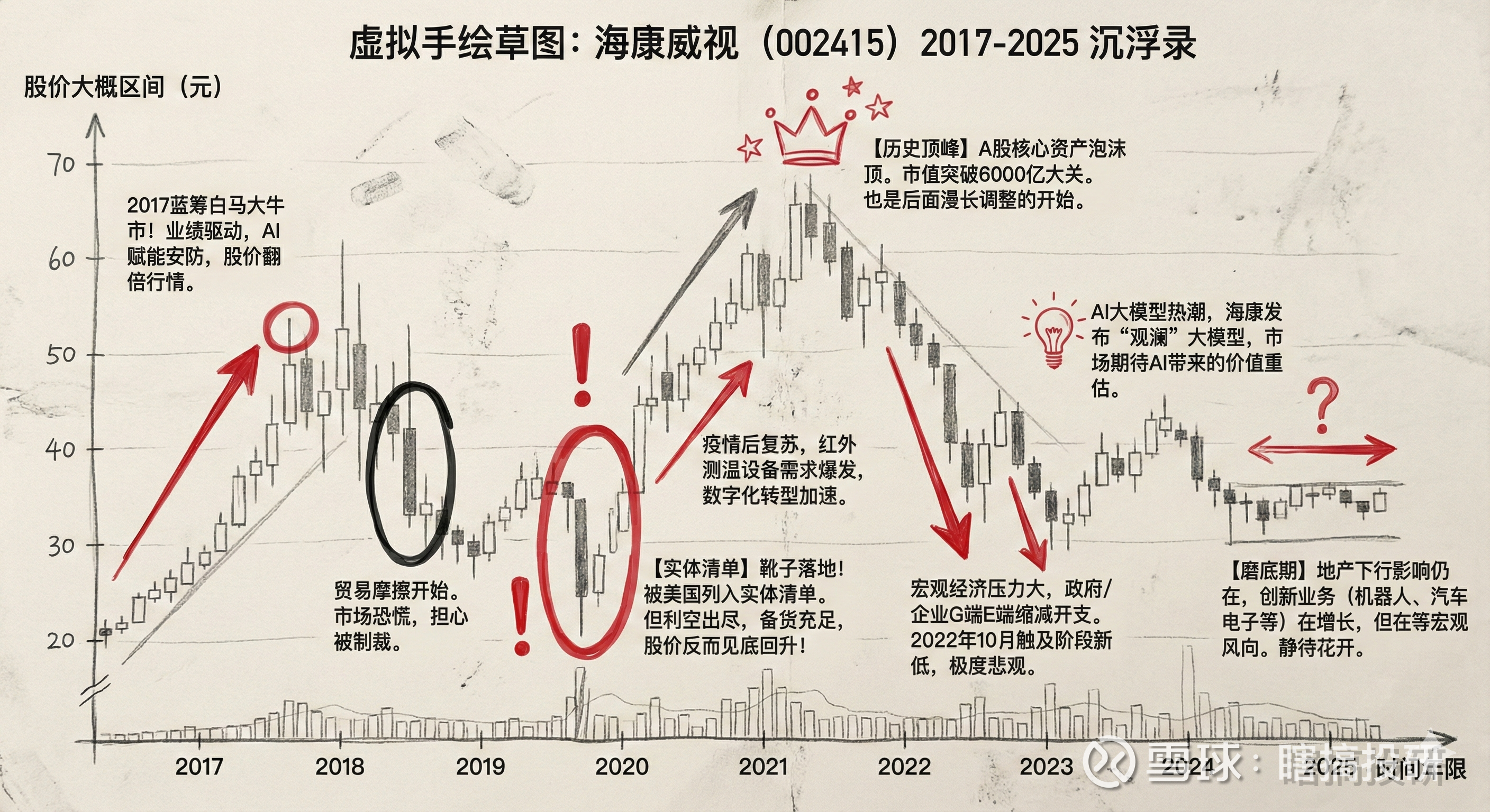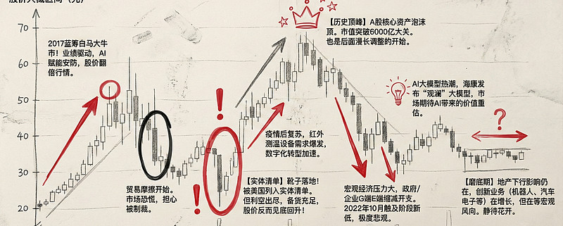 站在2025年,投资者看海康威视的眼神,早已从“悔意”变成了“恐惧”、“疲惫”以“敢问路在何方”的迷茫。这8年间,海康经历了太多:2018年的中美贸易摩擦序曲,2019年被列入“实体清单”,2020年XX疫X,2021年市值冲上5000亿又急转直下,2022年被加入SDN清单(非SDN中国军事综合体公司清单),此后是漫长的回调与横盘……
