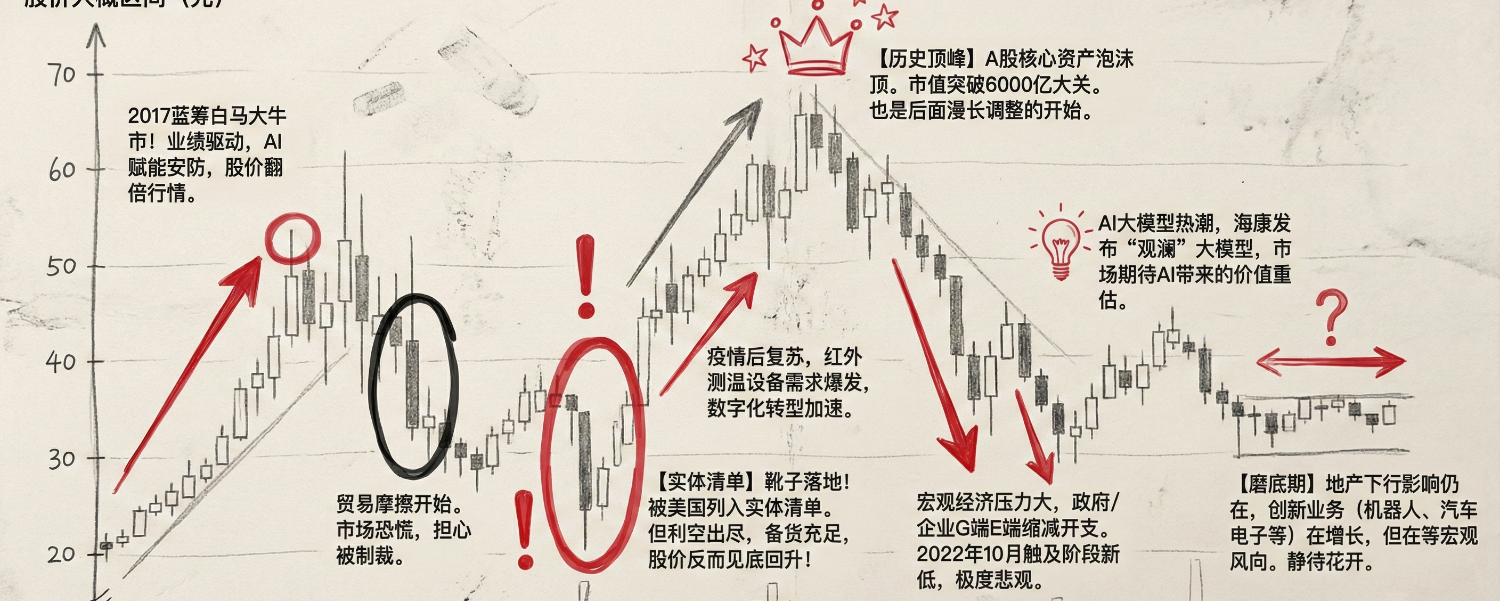 如果你在2017年买入海康并持有至今,你的体验大概是这样的:先是享受了一波凌厉的上涨,看着账面浮盈膨胀,然后遭遇外部冲击,市值腰斩,又反弹,又下跌……反反复复,身心俱疲。