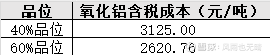 基于以上用量,计算得出 40% 品位铝土矿生产氧化铝的总成本为 3125.0,60% 品位铝土矿生产氧化铝的总成本为 2620.76 。可以看出,铝土矿品位对氧化铝生产成本影响较大,高品位铝土矿在生产氧化铝时,由于用量相对较少,在总成本中能有效降低原料成本,使得最终氧化铝生产成本降低。