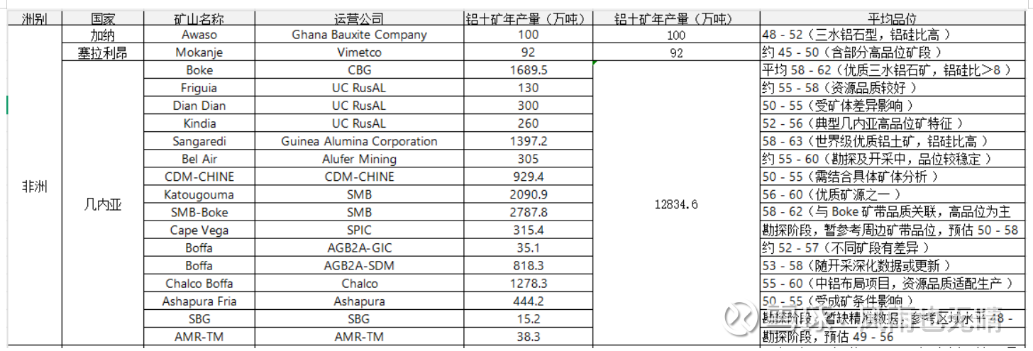从产量数据来看,不同地区和国家的铝土矿产量在全球铝土矿总产量中所占份额各有不同。其中非洲产量占比最大,而几内亚是非洲铝土矿产量的绝对主力;澳大利亚产量次之;全球铝土矿供应主要由这两个地区决定。