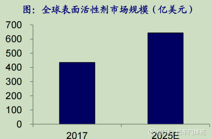 市场调研(Allied Market Research,AMR)发布的一份名为《表面活性剂市场的类型和应用:2018-2025年全球机遇分析和行业预 测》的报告中的数据所知,2017年全球表面活性剂市场价值为435.55亿美元,预计将在2025年达到644.08亿美元,2018年至2025 年的复合年增长率为5.4%。预计亚太地区将在整个预测期内成为收入最高的区域。北京国化新材料技术研究院有限公司及表面活 性剂发展中心共同发布的《中国非离子表面活性剂市场年度报告(2022版)》显示,预计2026年中国非离子表面活性剂总产能将达到466.0万吨/年。根据中商产业研究院的预测,2023年中国的表面活性剂市场规模预计将达到684.63亿元。而在全球范围内, 表面活性剂市场规模也在稳步增长;全球表面活性剂市场规模已达到约500亿美元,并且预计未来五年内有望突破700亿美元