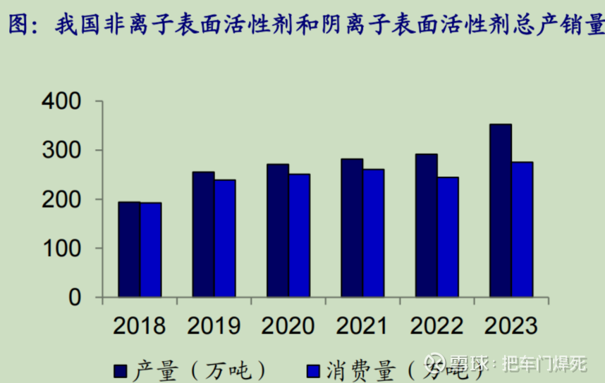 根据卓创资讯,2018-2023年我国非离子表面活性剂和阴离子表面活性剂总产量由193.7万吨提升至352.2万吨,复合增速为13%;非离子表面活性剂和阴离子表面活性剂总消费量由192.5万吨提升至275.1万吨,复合增速为7% 。