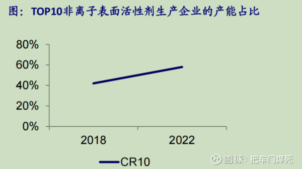 根据卓创资讯,我国非离子表面活性剂CR5为52%。根据中国洗涤用品工业协会,2018-2022年,非离子表面活性剂的产能集中度 提升。截至2022年,TOP10生产企业的产能占比约58%,较2018年增长16个百分点。