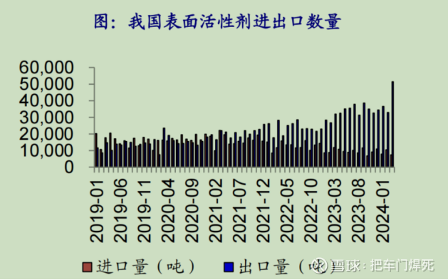 我国表面活性剂出口数量持续增长,进口数量持续减少。据海关数据统计,2024年3月国内非离子表面活性剂进口数量为 7480.752吨,进口同比减少了36.84%。据海关数据统计,2024年3月国内非离子表面活性剂出口量达到51502.932吨,出口同比增 加60.89%。据海关数据统计,2024年3月国内阴离子表面活性剂进口数量为7382.581吨,进口同比上涨60.42%。据海关数据统 计,2024年3月国内阴离子表面活性剂出口量达到54961.16吨,出口同比增加23.78%。