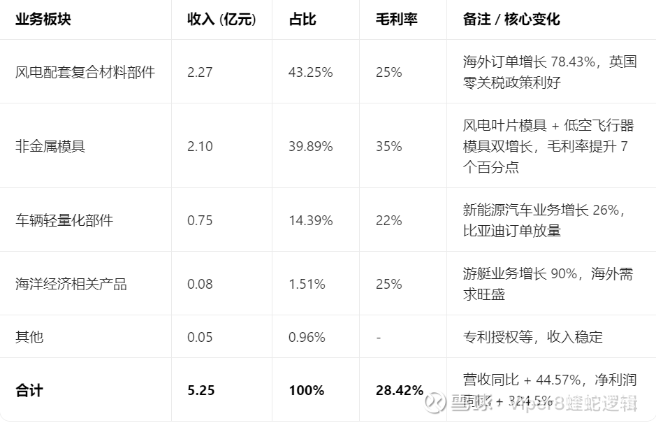 营业收入:7.30 亿元,同比 + 15.41%,原因:①风电行业复苏,海外订单增长(英国风电零关税政策预期);②新能源汽车轻量化业务放量,比亚迪订单贡献显著增长;③游艇业务高速增长(+90%)。